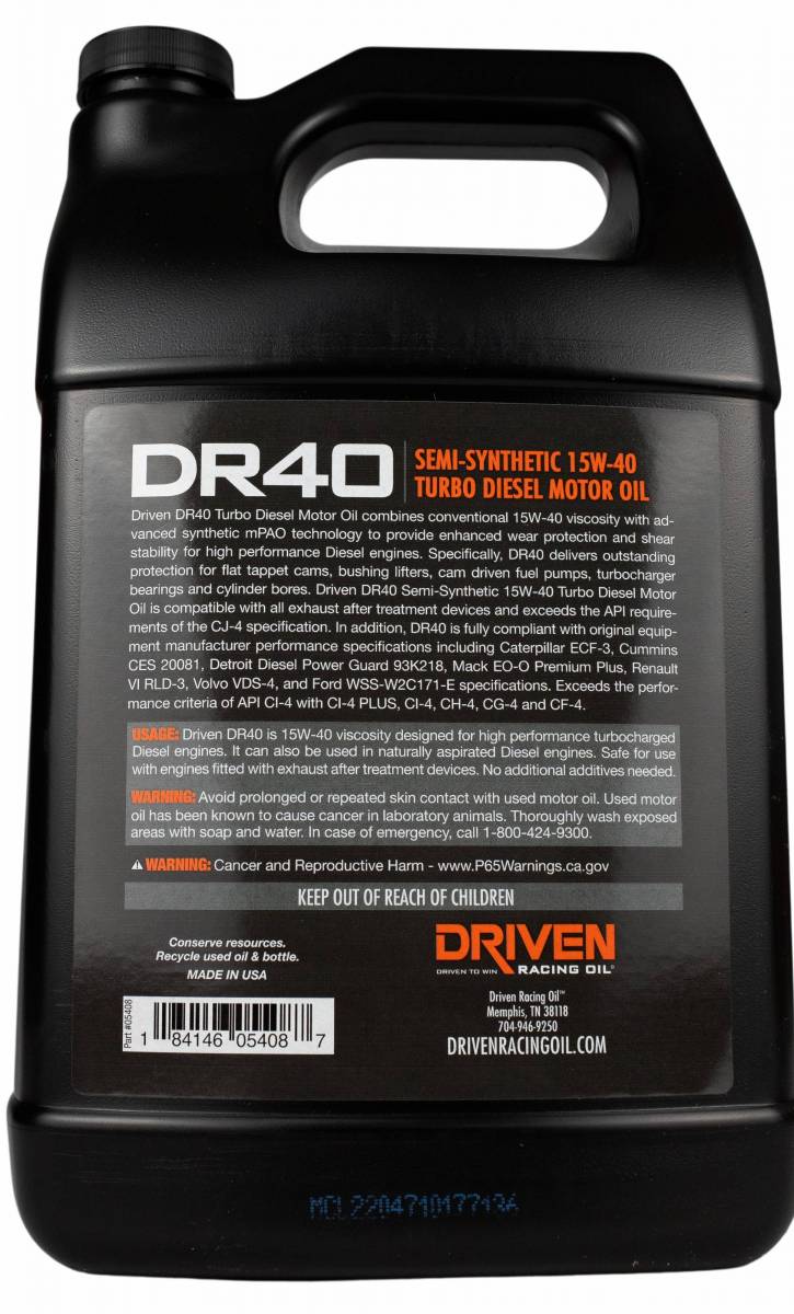 DRIVEN DR40 is a Racing Oil formulated for High Performance Engines/Racing applications only. This engine oil will NOT MEET any current API or OEM Engine Oil Specifications. These engine oils are not intended for use in On-Road vehicles equipped with DPF's and other emission equipment.