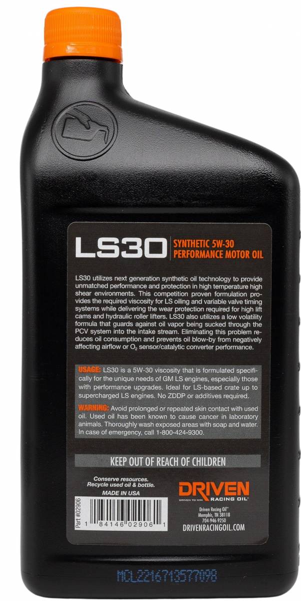 DRIVEN LS30 Racing Oil is formulated for High Performance Engines/Racing applications only. This engine oil will NOT MEET any current API or OEM Engine Oil Specifications.