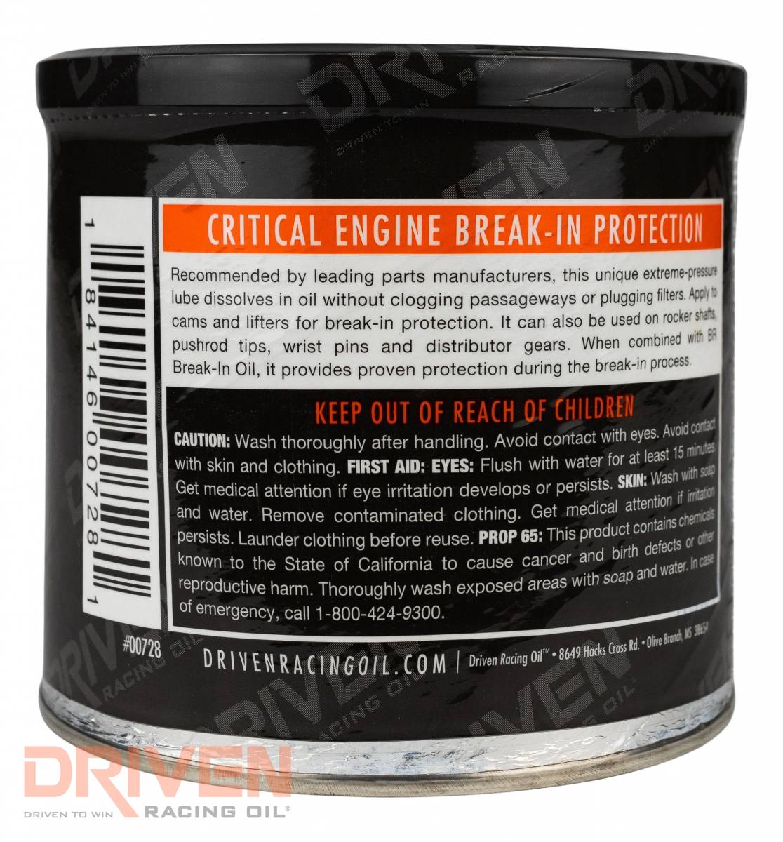 Recommended by leading camshaft manufacturers, this unique extreme pressure lube dissolves completely in oil without clogging oil passageways or plugging oil filters. Proven to cling to and protect surfaces during initial start-up, Driven Engine Assembly Grease delivers protection you can count on. Apply to cams and lifters for break-in protection. It can also be used on distributor gears, rocker shafts, rocker tips, pushrod tips, wrist pins and valve guides. Combined with BR series break-in oils provides proven protection during break-in.